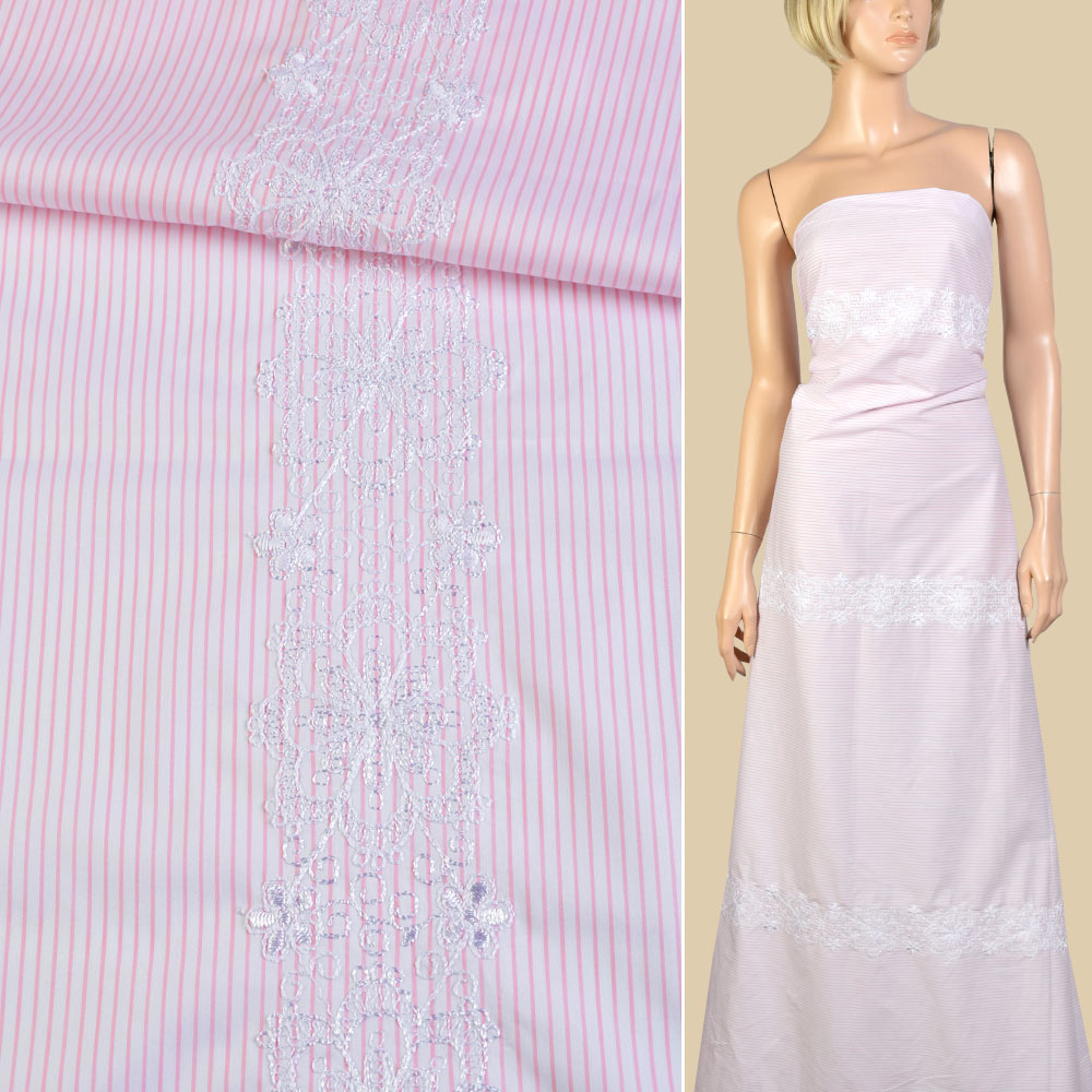 Котон білий в рожеву смужку, біла квіткова вишивка (3 смуги уздовж тканини) ш.150 купить в розницу и оптом