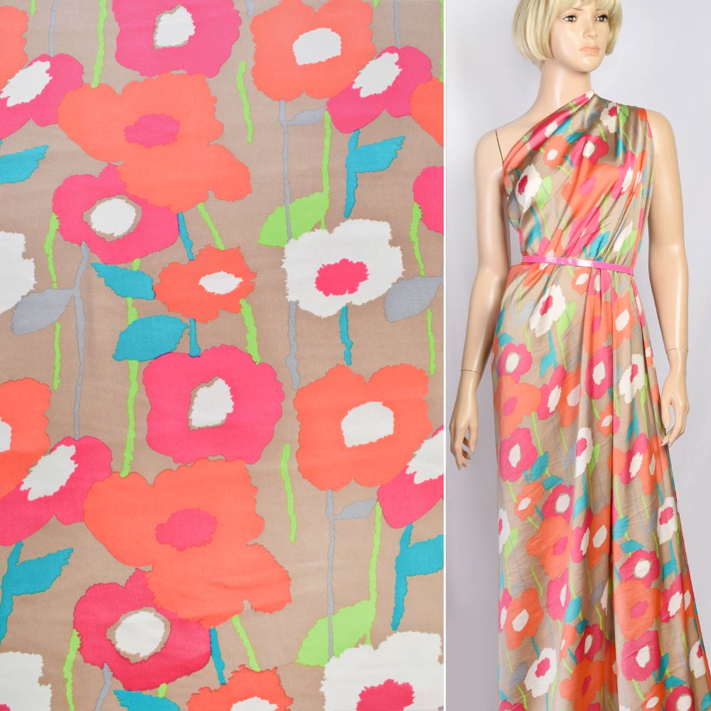 Шовк японський бежевий в малинові, білі, помаранчеві квіти, ш.145 купить в розницу и оптом