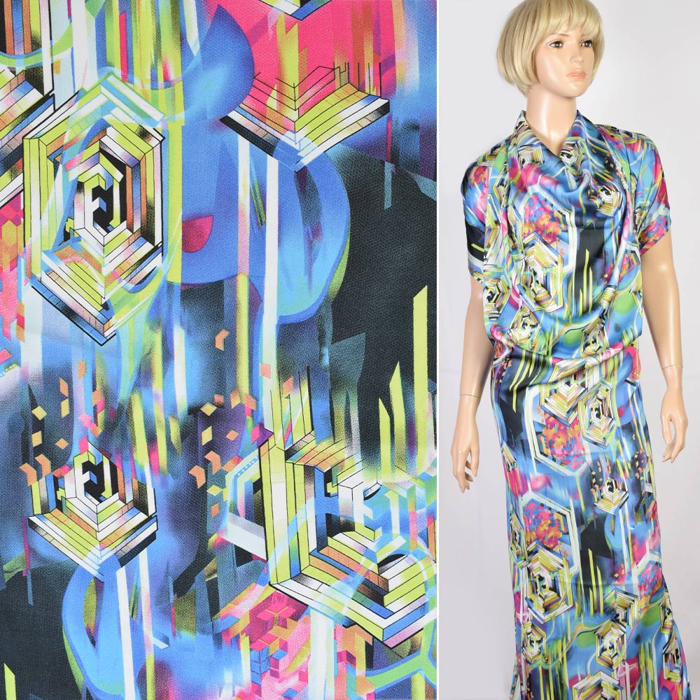 Шовк японський блакитний в салатово-рожевий абстрактний малюнок, ш.150 купить в розницу и оптом