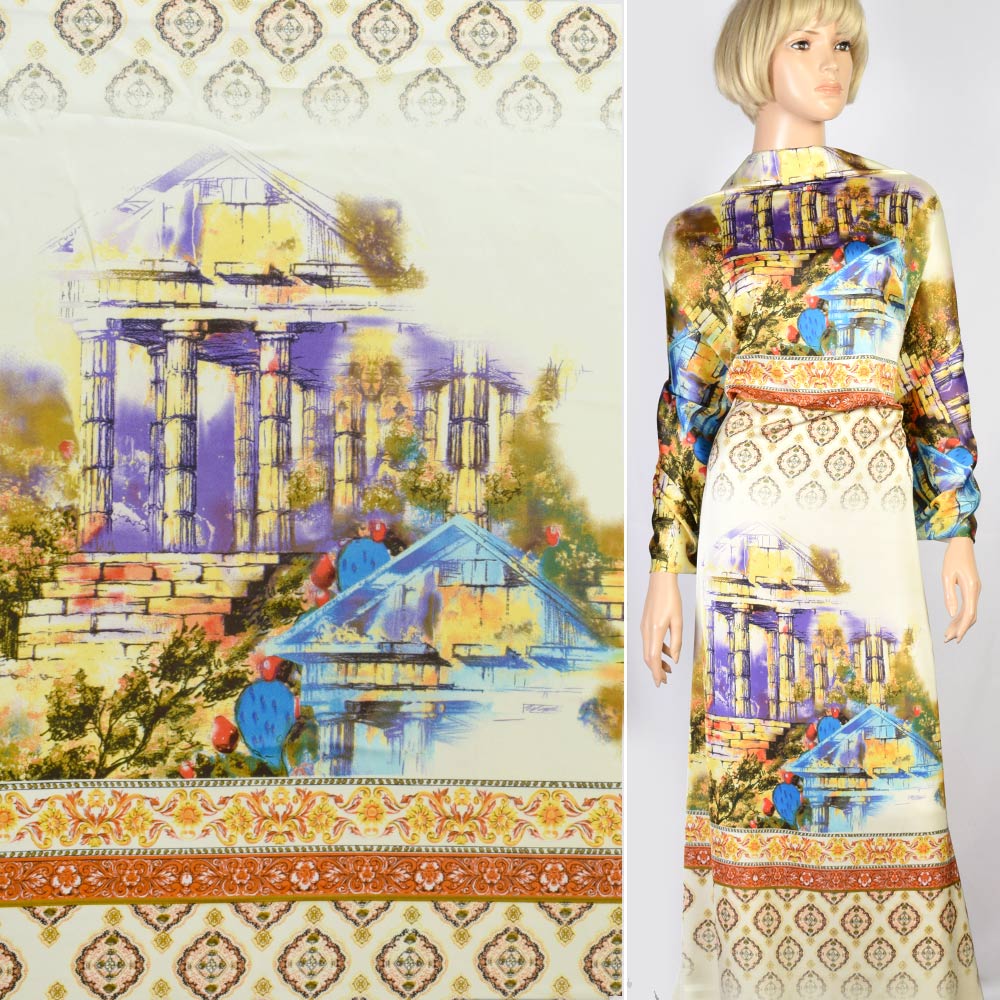 Шовк японський кремовий в чорно-помаранчевий орнамент, раппорт 70см, ш.155 купить в розницу и оптом