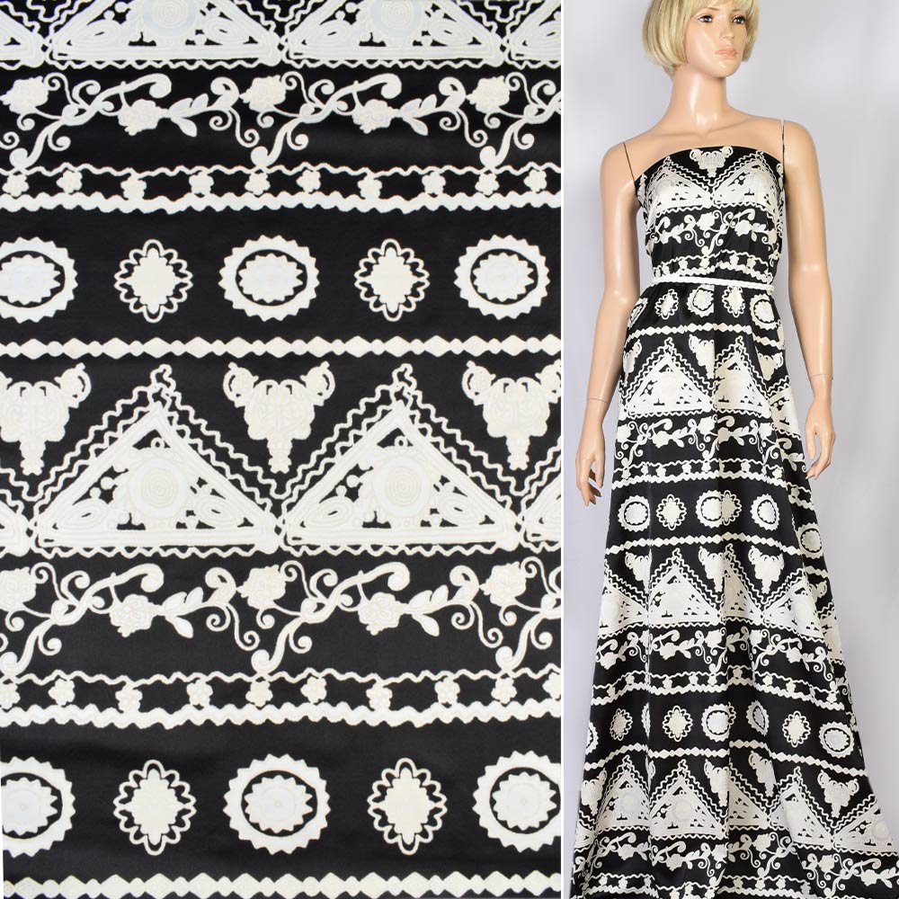 Шовк японський стрейч чорний в молочно-білі мереживні візерунки, ш.150 купить в розницу и оптом