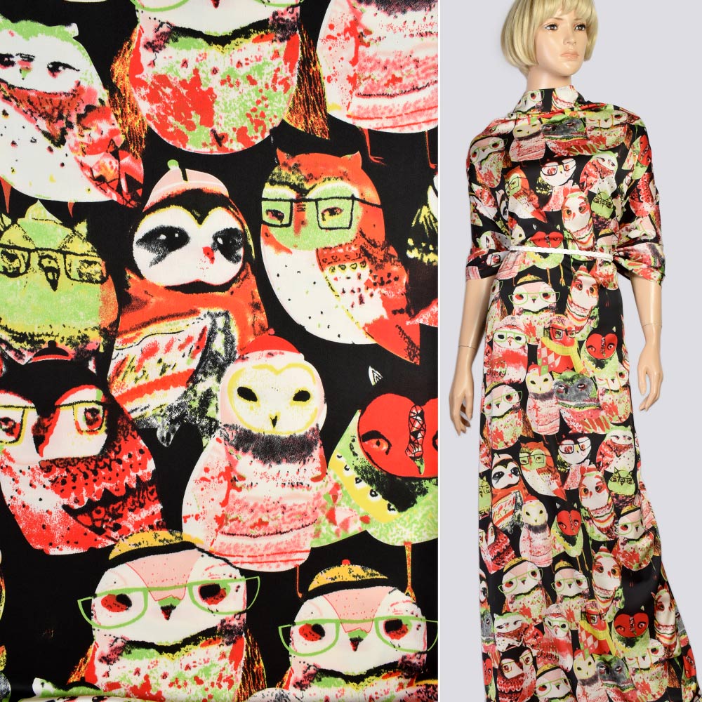 Шовк японський стрейч чорний в зелені та червоні сови, ш.150 купить в розницу и оптом