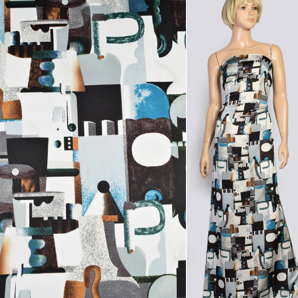 Шовк японський стрейч сірий в чорно-бірюзовий абстрактний малюнок, ш.145 купить в розницу и оптом