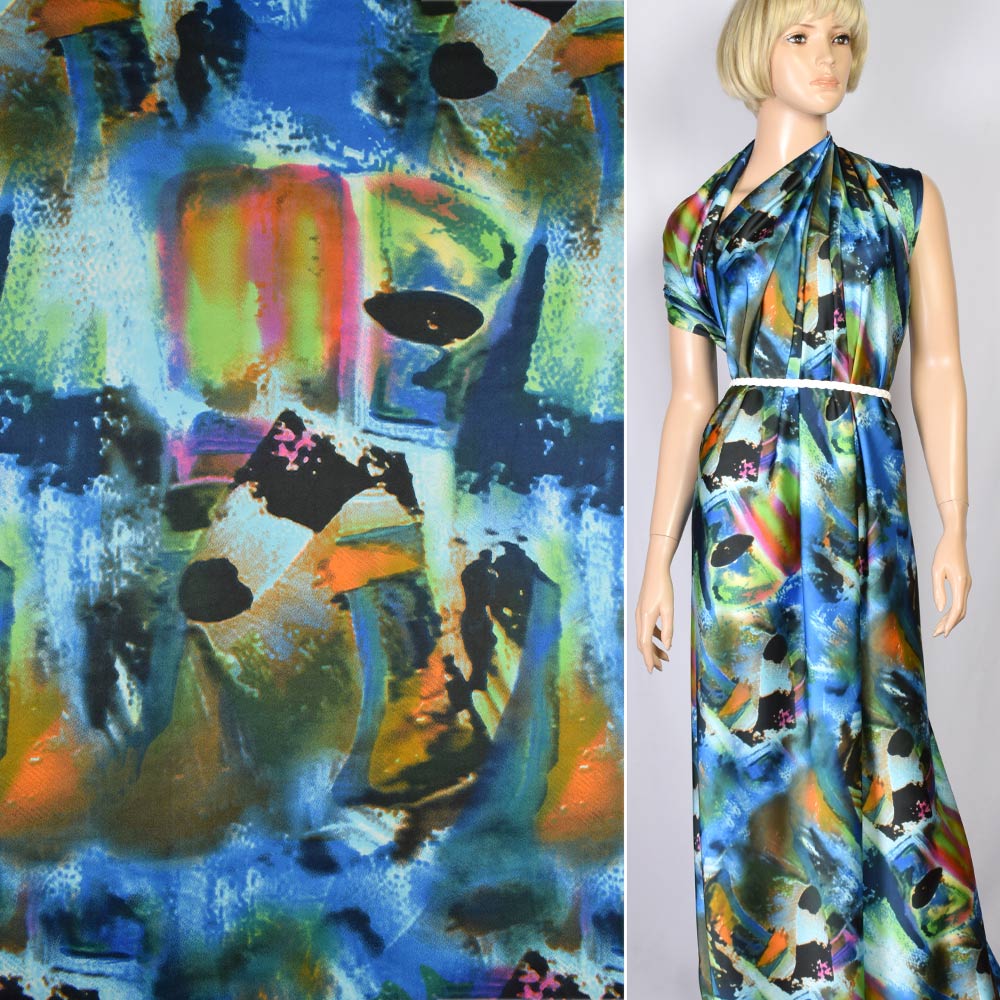 Шовк японський стрейч синій в рожево-чорно-зелений абстрактний малюнок, ш.150 купить в розницу и оптом