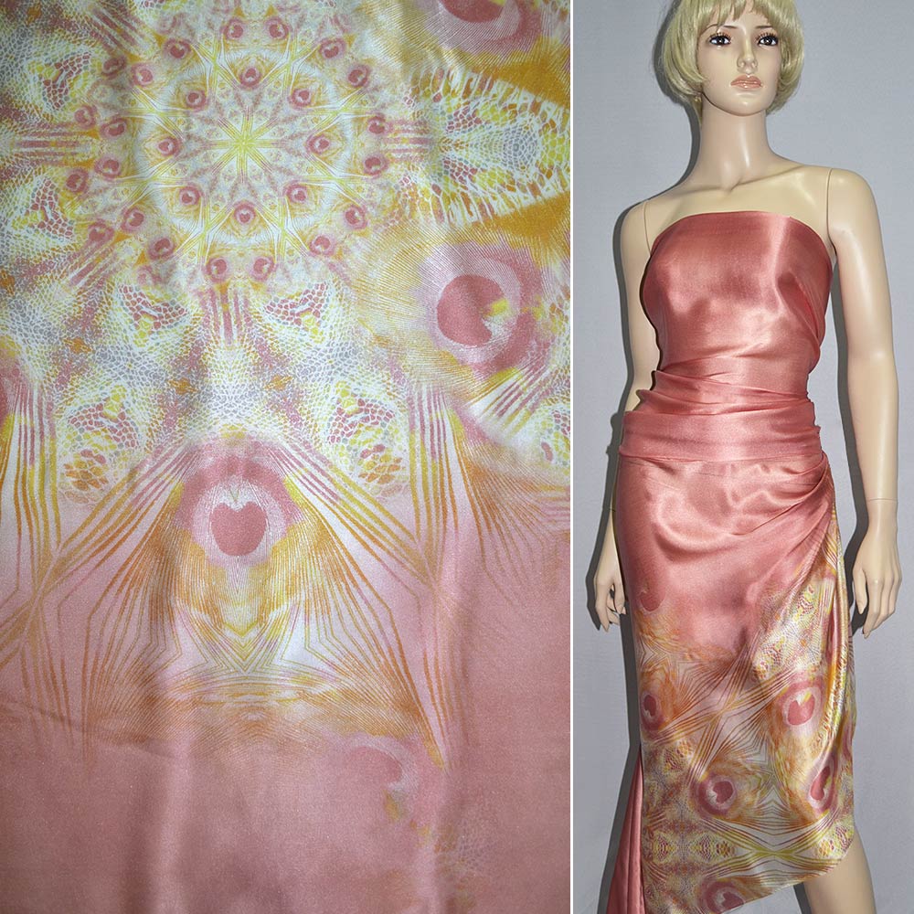 Шовк коралово-рожевий з молочно-жовтим орнаментом, 1-ст. купон, ш.140 купить в розницу и оптом