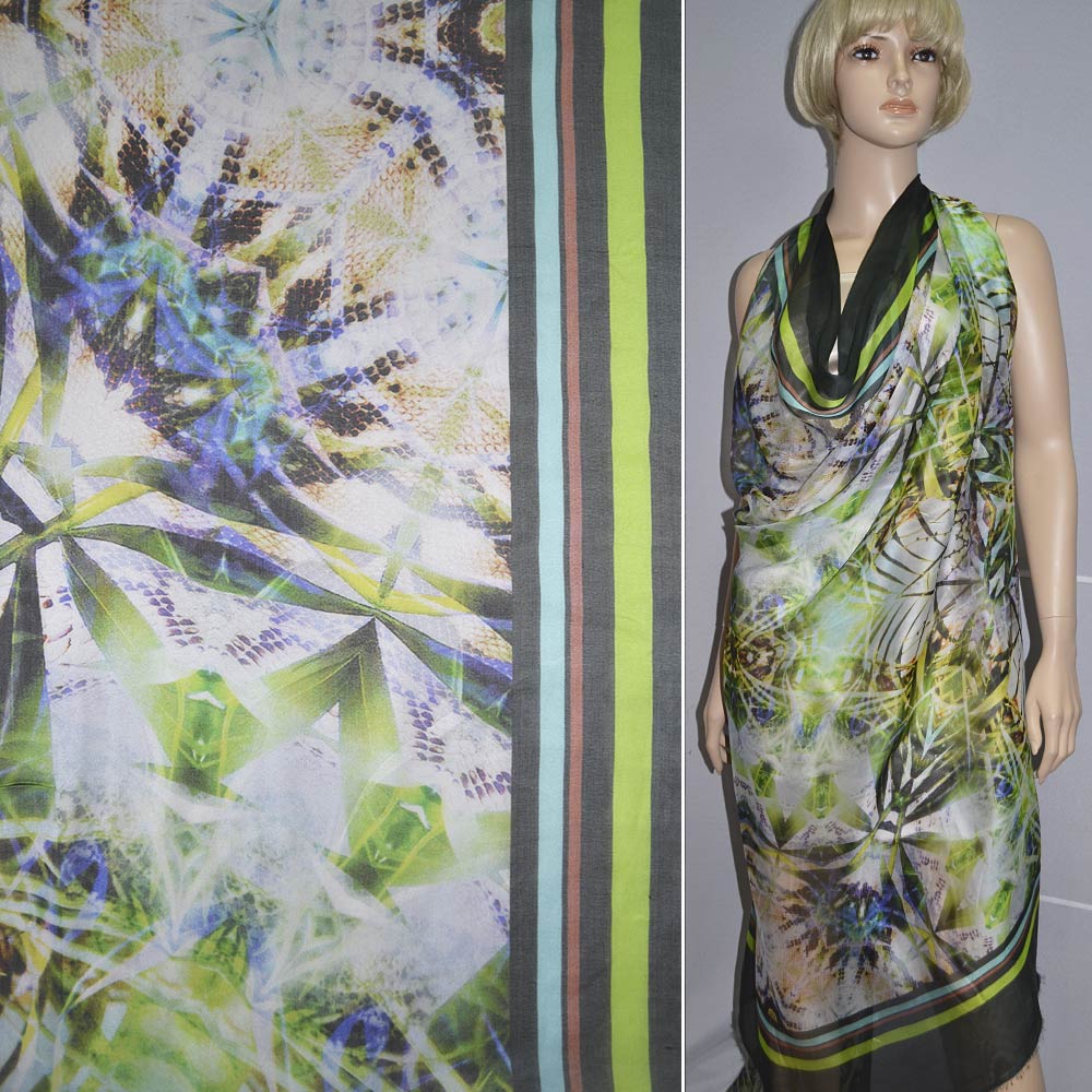 Шовк молочний в салатовий малюнок, чорна облямівка з кольоровими смужками 2-ст. купон ш.137 купить в розницу и оптом