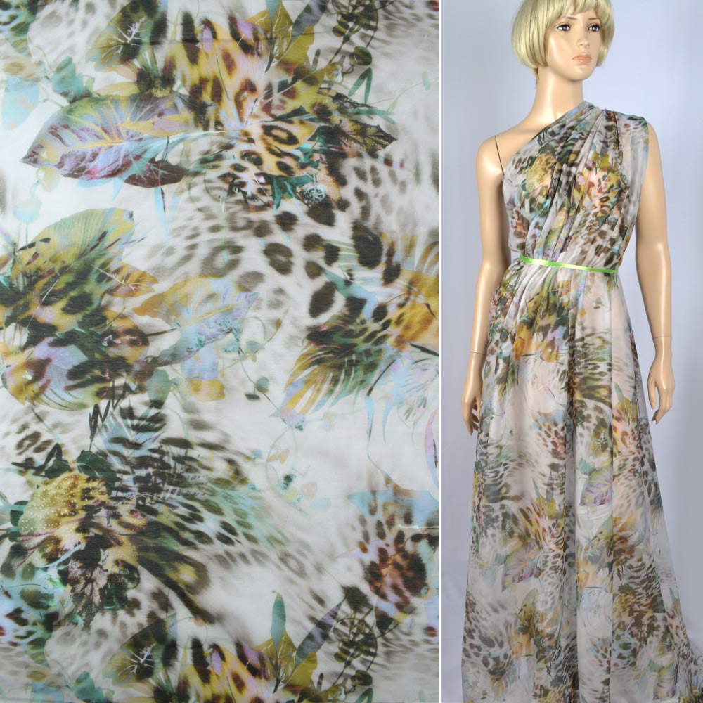 Шовк-батист сіро-бежевий з бузково-коричнево-зеленим принтом ш.139 купить в розницу и оптом