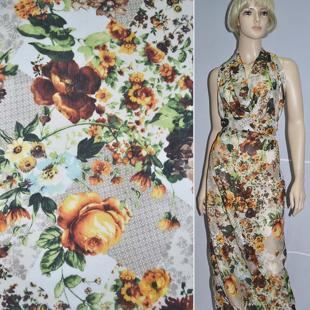 Шовк молочний в коричнево-помаранчеві квіти ш.139 купить в розницу и оптом