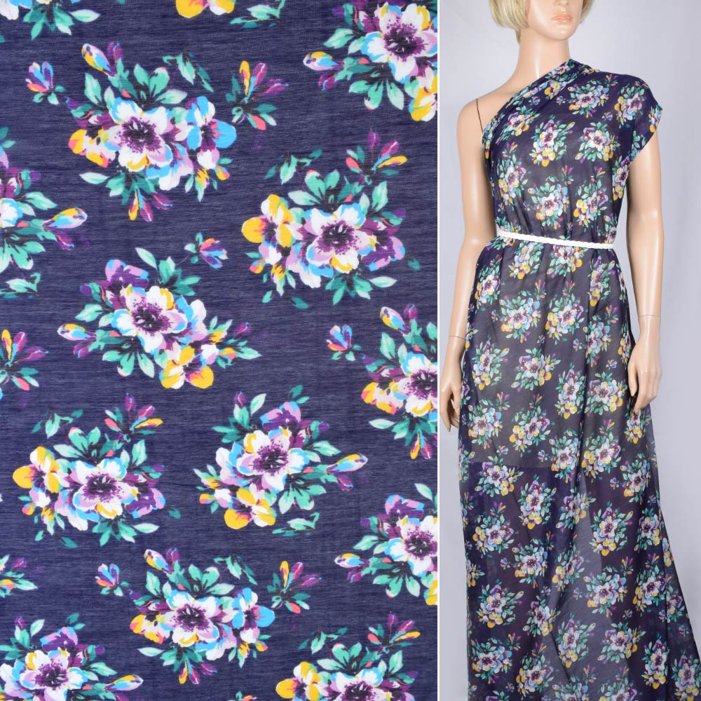 Шовк синій з молочно-бузковими квітами ш.137 купить в розницу и оптом