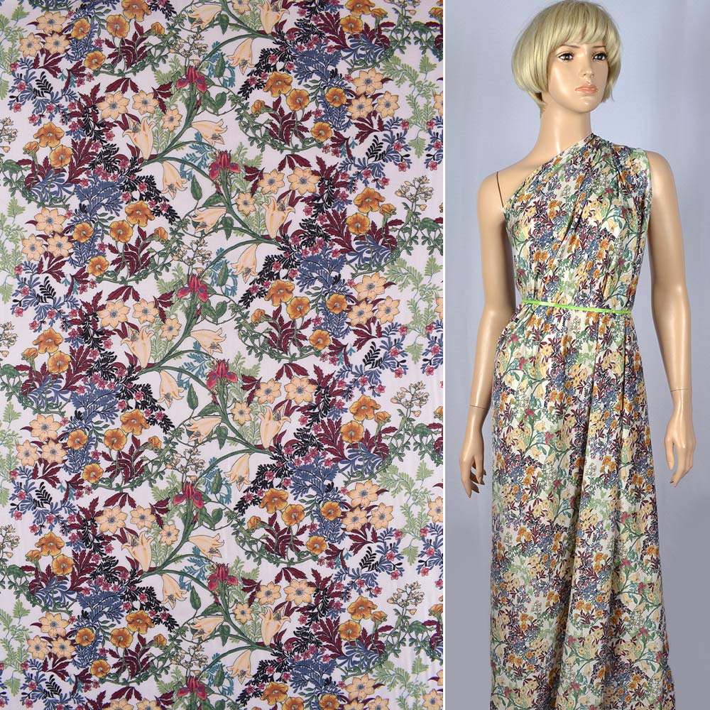 Шовк з віскозою молочний в жовто-бордово-зелений рослинний візерунок ш.134 купить в розницу и оптом
