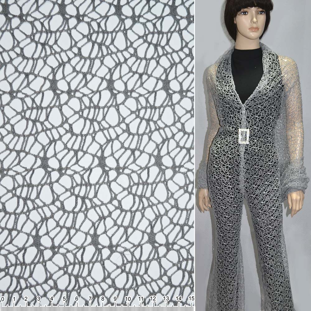Сітка мереживо павутиння сіра ш.175. Склад тканини: Поліамід-30, Поліестер-70. Щільність тканини 112 г/м.кв. Країна виробник: Південна Корея. Легкий, пластичний, ажурний матеріал з матовою та фактурною поверхнею. На дотик м'який. Еластичний завдяки сітчастій основі. Матеріал легко лягає за будь-якою формою і комфортний при носінні облягаючих виробів. Використовується для пошиття одягу на підкладці, так і для обробки. Використовується для пошиття блуз, топів, сукні, спідниць, білизни, а також як декор.Дякуємо за ваш вибір.