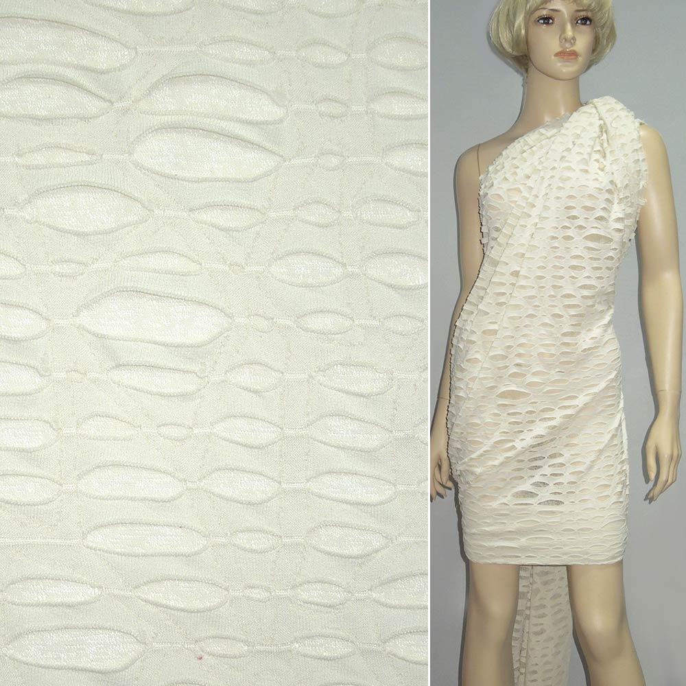 Трикотаж молочний рваний ш.150. Склад тканини: Віскоза-20, Поліамід-40, Поліестер-40. Щільність тканини 166 г/м.кв. Країна виробник: Південна Корея. Трикотаж – це м'яка щільна матерія, не прозора. Приємна на дотик, комфортна в носінні. Завдяки вмісту синтетичних матерій, матеріал більш зносостійкий та надовго зберігає свій первісний вигляд. Тканина відрізняється своєю приємною текстурою, гарною розтяжністю, практично не здається. Трикотаж досить простий у догляді. Використовується для пошиття суконь, спортивних костюмів, легких жакетів, поло, футболок та багато іншого.Дякуємо за ваш вибір.