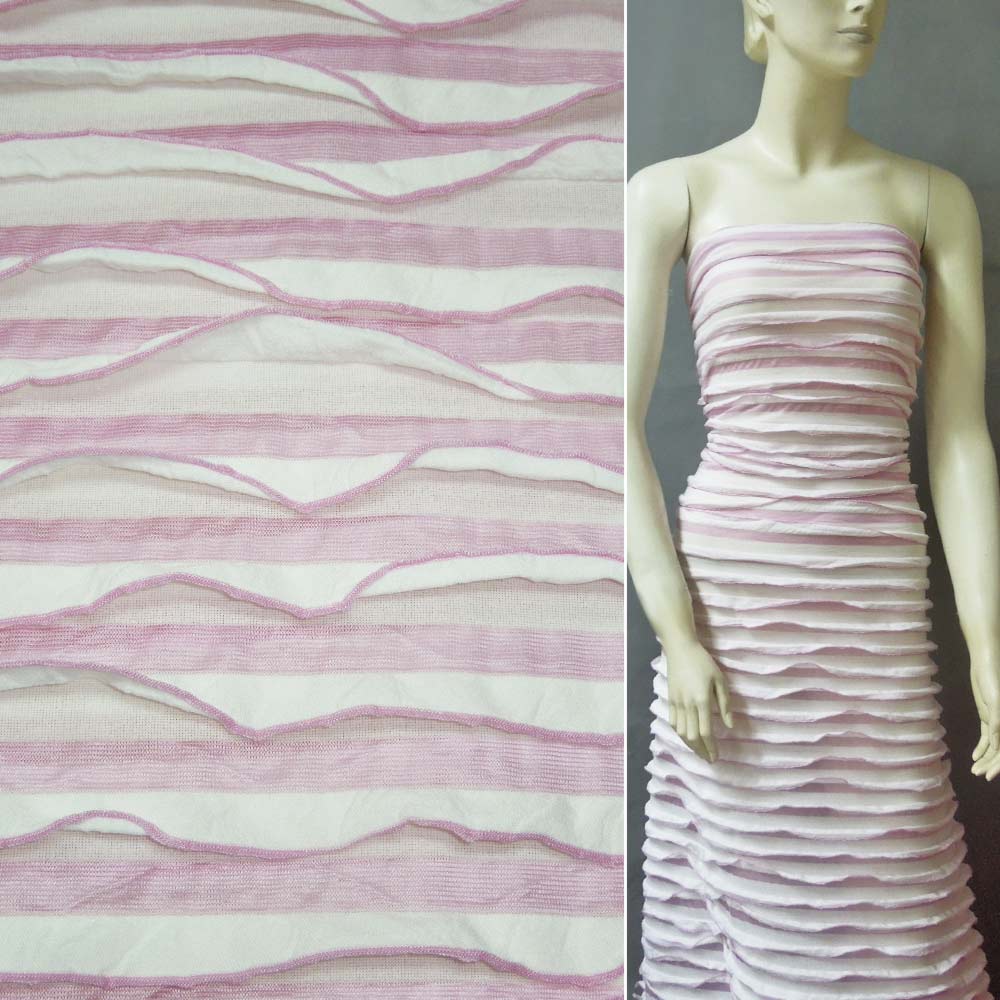 Трикотаж молочно-рожевий з рюшами ш.150. Склад тканини: Поліакріл-30, Поліамід-30, Поліестер-30, Еластан-1. Щільність тканини 240 г/м.кв. Країна виробник: Південна Корея. Трикотаж – це м'яка щільна матерія, не прозора. Приємна на дотик, комфортна в носінні. Завдяки вмісту синтетичних матерій, матеріал більш зносостійкий та надовго зберігає свій первісний вигляд. Тканина відрізняється своєю приємною текстурою, гарною розтяжністю, практично не здається. Трикотаж досить простий у догляді. Використовується для пошиття суконь, спортивних костюмів, легких жакетів, поло, футболок та багато іншого.Дякуємо за ваш вибір.