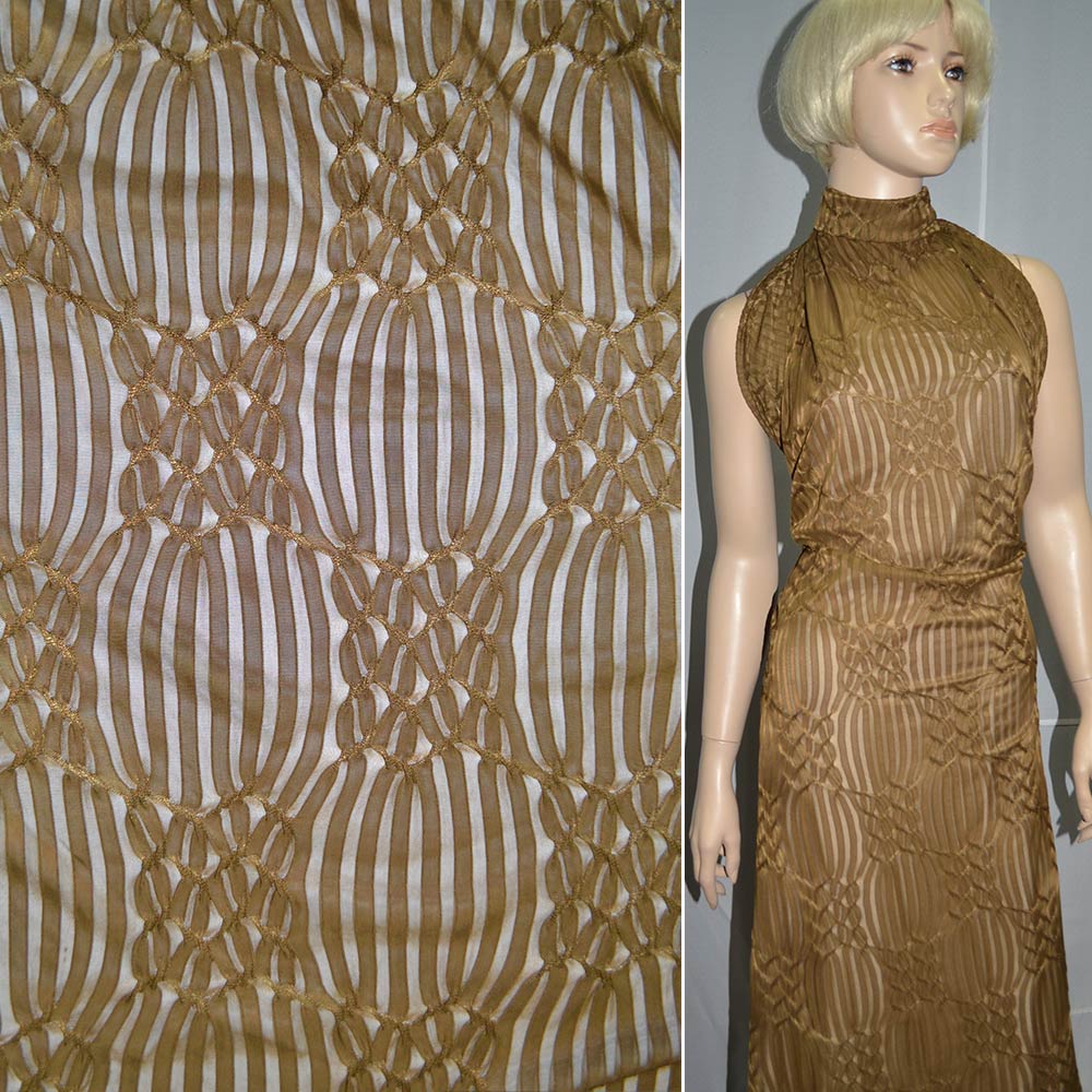 Трикотаж коричневий з ажурними смужками ш.160. Склад тканини: Поліестер-100. Щільність тканини 149 г/м.кв. Країна виробник: Південна Корея. Трикотаж – це м'яка щільна матерія, не прозора. Приємна на дотик, комфортна в носінні. Завдяки вмісту синтетичних матерій, матеріал більш зносостійкий та надовго зберігає свій первісний вигляд. Тканина відрізняється своєю приємною текстурою, гарною розтяжністю, практично не здається. Трикотаж досить простий у догляді. Використовується для пошиття суконь, спортивних костюмів, легких жакетів, поло, футболок та багато іншого.Дякуємо за ваш вибір.