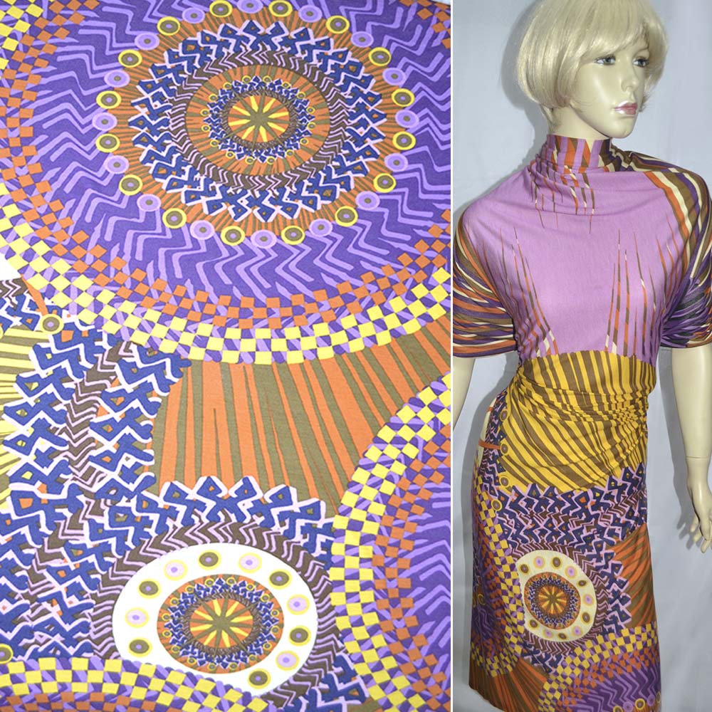 Трикотаж віскозний фіолетовий в оранжево-жовті кола ш.158 купить в розницу и оптом