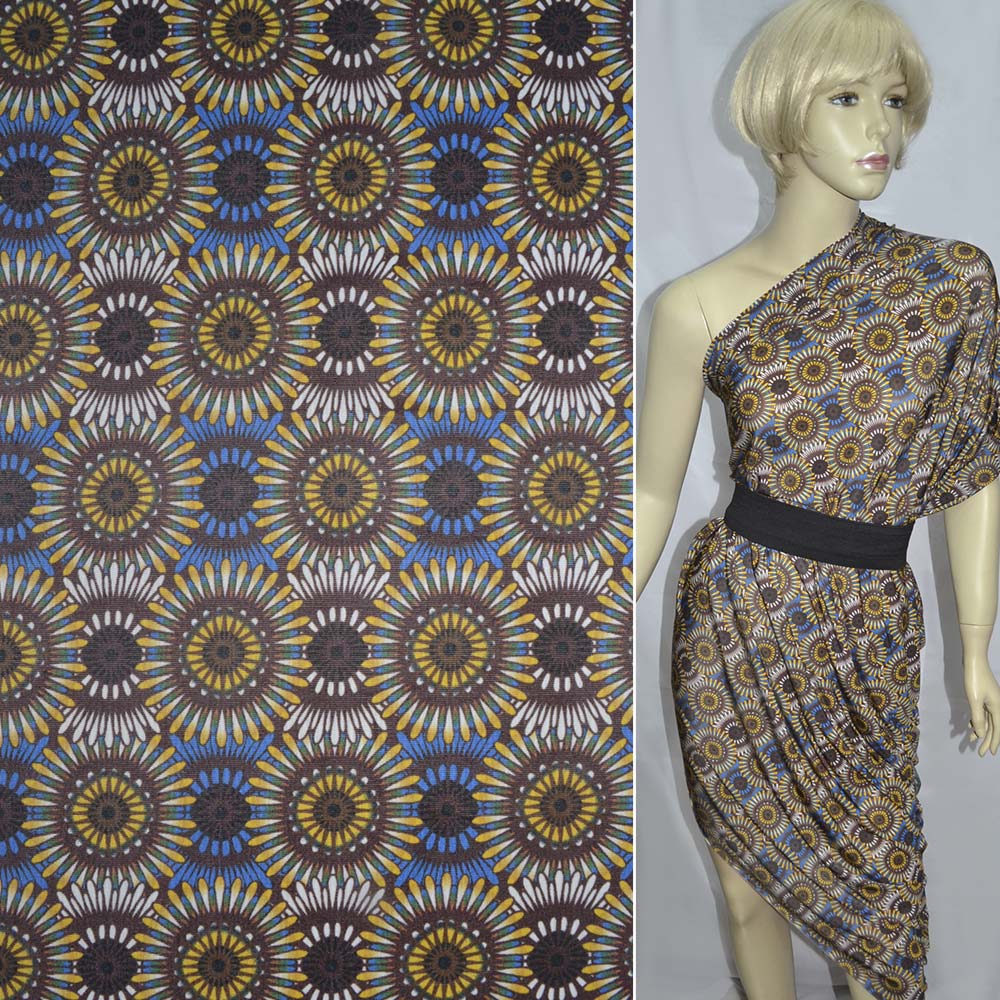 Трикотаж віскозний мокрий стрейч коричневий в жовто-блакитні соняшники ш.145. Склад тканини: Віскоза-93, Еластан-7. Щільність тканини 170 г/м.кв. Країна виробник: Німеччина. Трикотаж – це м'яка щільна матерія, не прозора. Приємна на дотик, комфортна в носінні. Завдяки вмісту синтетичних матерій, матеріал більш зносостійкий та надовго зберігає свій первісний вигляд. Тканина відрізняється своєю приємною текстурою, гарною розтяжністю, практично не здається. Трикотаж досить простий у догляді. Використовується для пошиття суконь, спортивних костюмів, легких жакетів, поло, футболок та багато іншого.Дякуємо за ваш вибір.
