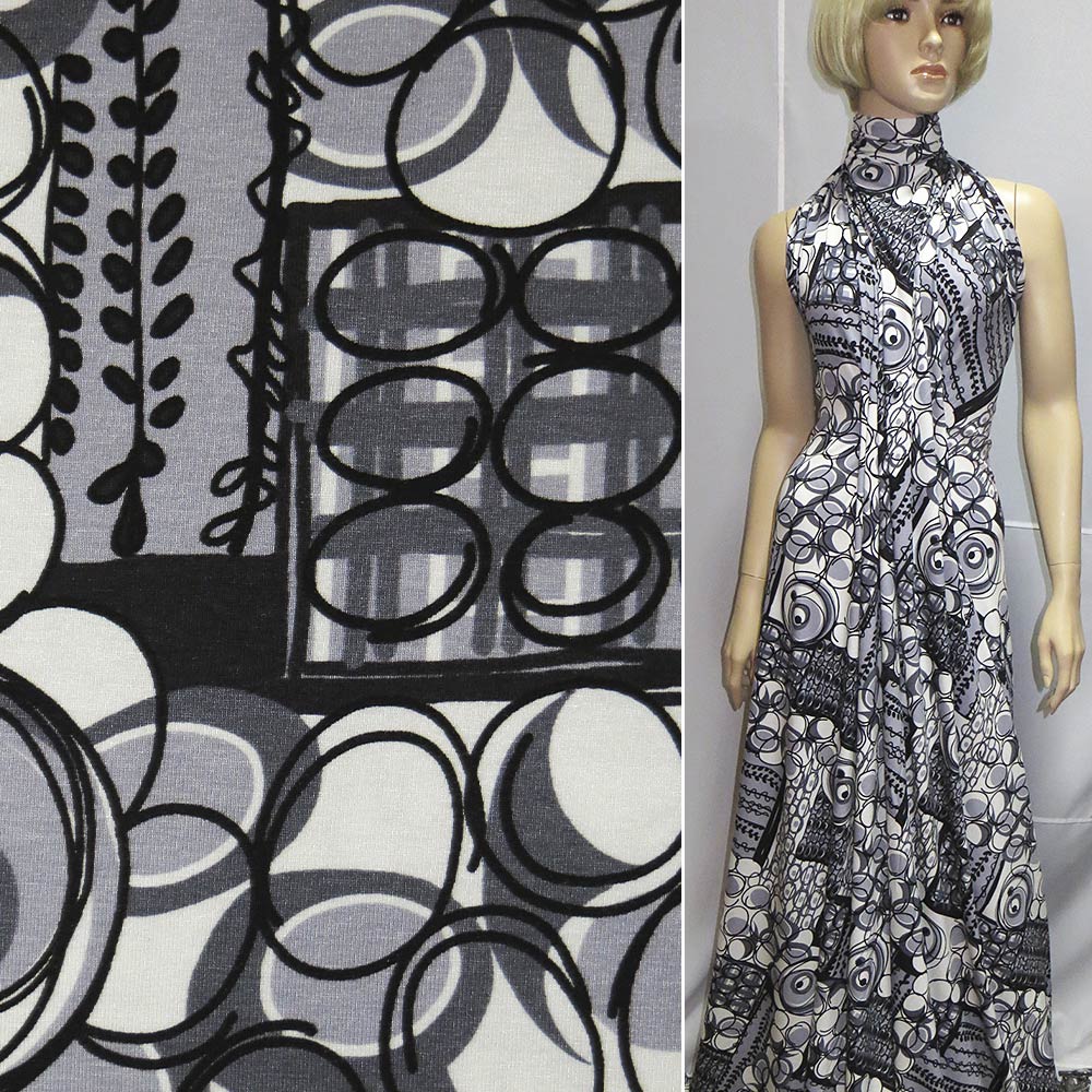 Трикотаж віскозний стрейч біло-сірий в чорні кола, квадрати, гілочки ш.145 купить в розницу и оптом