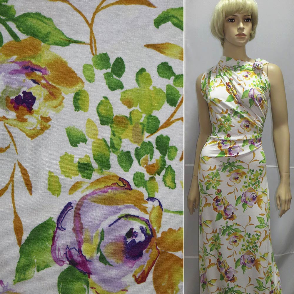 Трикотаж віскозний стрейч білий, фіолетові троянди, зелене листя ш.140. Склад тканини: Віскоза-94, Еластан-6. Щільність тканини 171 г/м.кв. Країна виробник: Німеччина. Трикотаж – це м'яка щільна матерія, не прозора. Приємна на дотик, комфортна в носінні. Завдяки вмісту синтетичних матерій, матеріал більш зносостійкий та надовго зберігає свій первісний вигляд. Тканина відрізняється своєю приємною текстурою, гарною розтяжністю, практично не здається. Трикотаж досить простий у догляді. Використовується для пошиття суконь, спортивних костюмів, легких жакетів, поло, футболок та багато іншого.Дякуємо за ваш вибір.