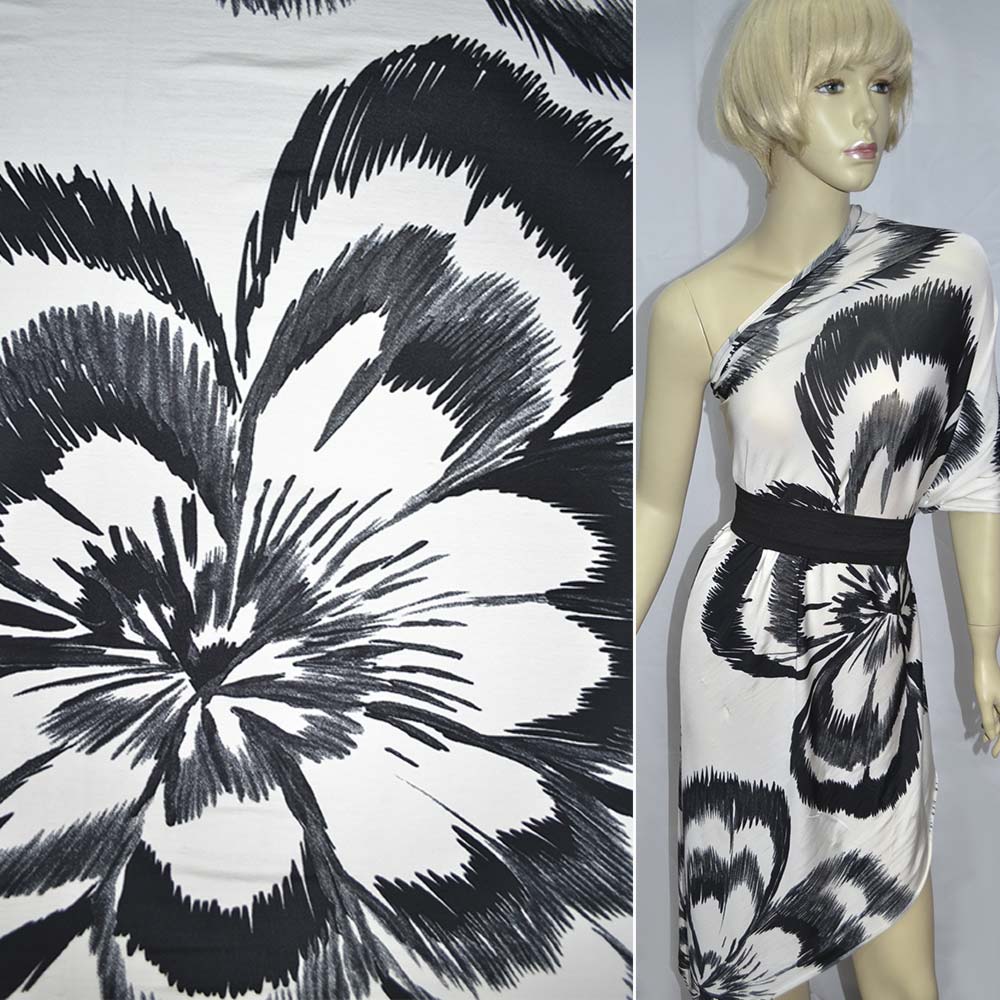 Трикотаж віскозний стрейч білий з великими чорними квітами ш.140. Склад тканини: Віскоза-92, Еластан-8. Щільність тканини 210 г/м.кв. Країна виробник: Німеччина. Трикотаж – це м'яка щільна матерія, не прозора. Приємна на дотик, комфортна в носінні. Завдяки вмісту синтетичних матерій, матеріал більш зносостійкий та надовго зберігає свій первісний вигляд. Тканина відрізняється своєю приємною текстурою, гарною розтяжністю, практично не здається. Трикотаж досить простий у догляді. Використовується для пошиття суконь, спортивних костюмів, легких жакетів, поло, футболок та багато іншого.Дякуємо за ваш вибір.