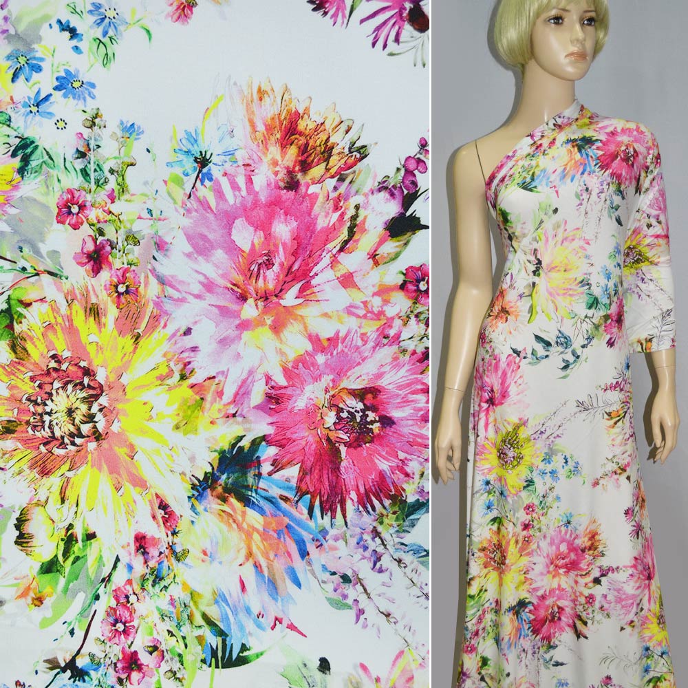 Трикотаж віскозний стрейч білий з рожево-жовтими квітами ш.146 купить в розницу и оптом