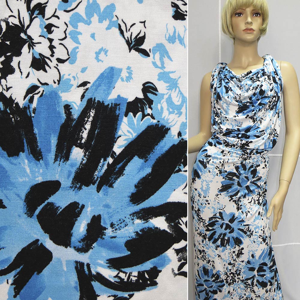 Трикотаж віскозний стрейч білий з квітами чорно-блакитними ш.140 купить в розницу и оптом