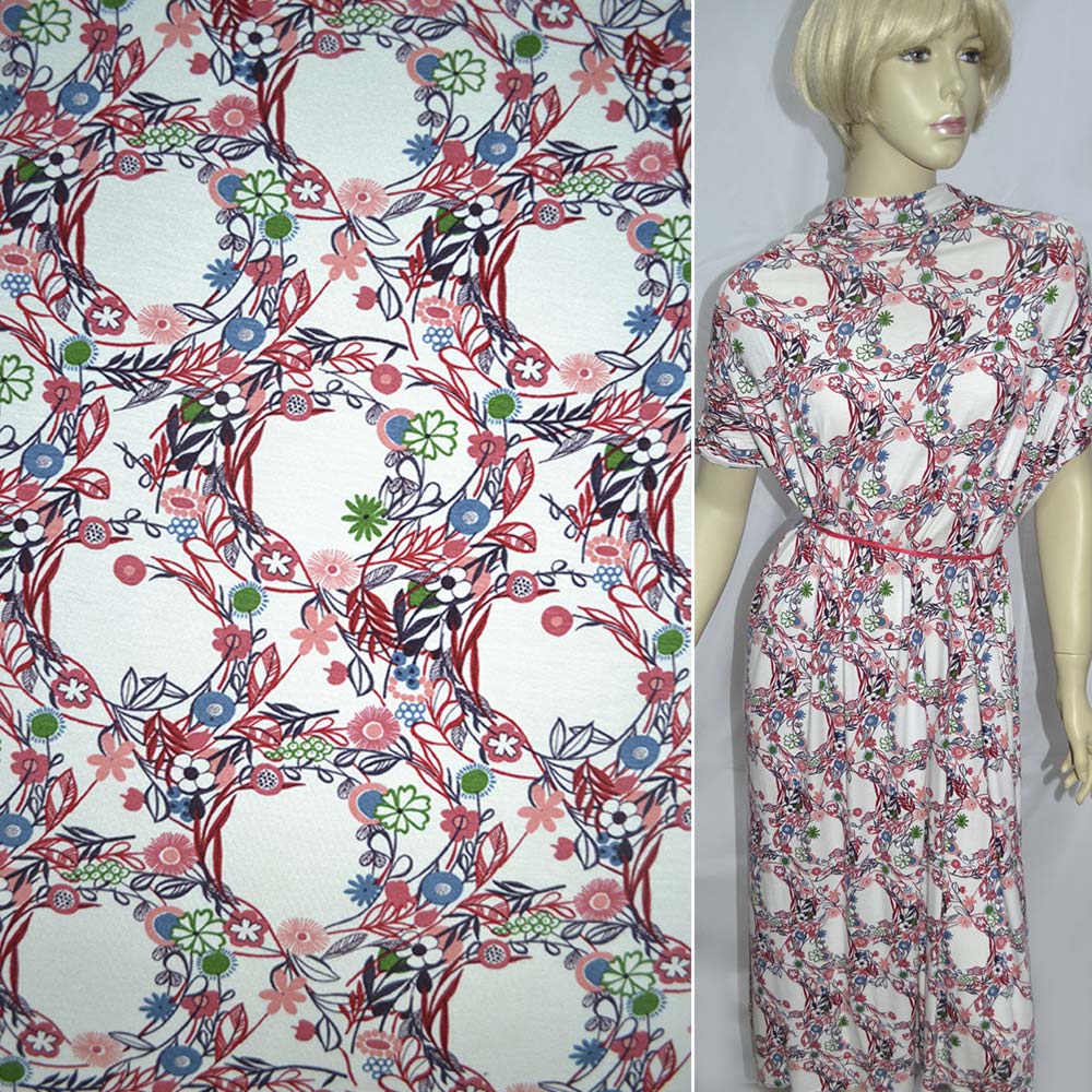Трикотаж віскозний стрейч білий з кучерявими червоно-білими квітами ш.143 купить в розницу и оптом