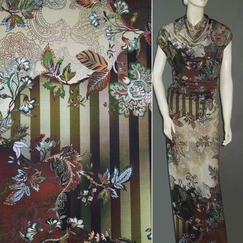 Трикотаж віскозний стрейч бежево-оливковий в смужку і бордово-зеленим кольоровим малюнком ш.150 купить в розницу и оптом