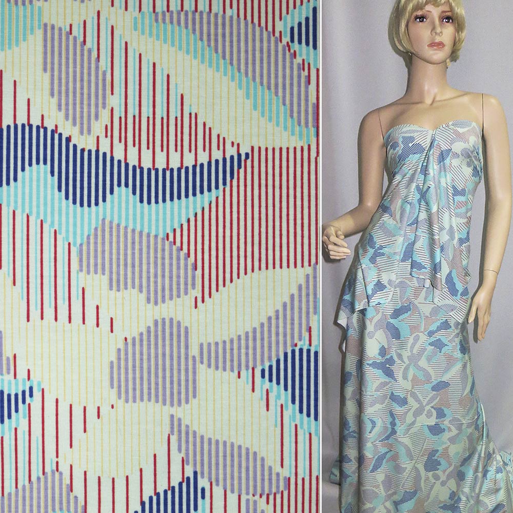 Трикотаж віскозний стрейч блідо-блакитний в сині, голубі, червоні смужки і абстрактний малюнок ш.145 купить в розницу и оптом