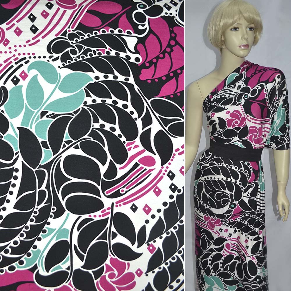 Трикотаж віскозний стрейч чорно-білий в малиново-бірюзову абстракцію ш.150 купить в розницу и оптом