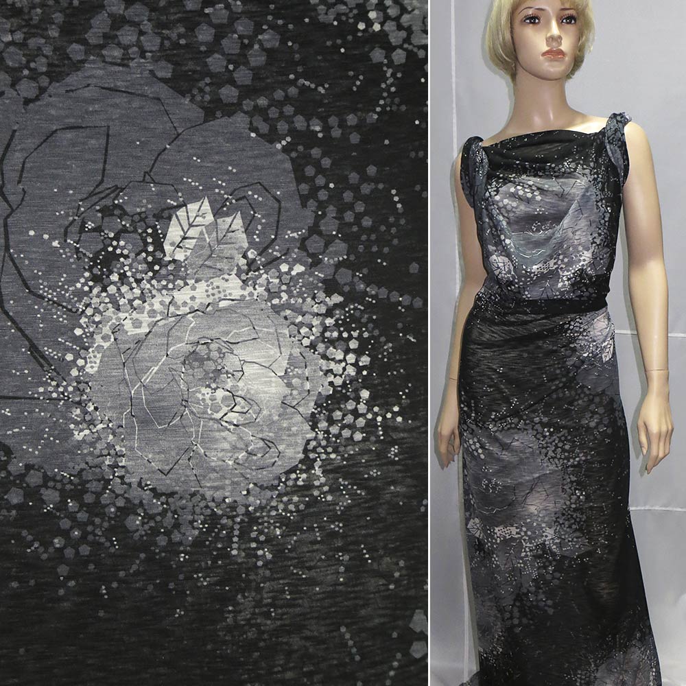 Трикотаж віскозний стрейч чорно-сірий з ромбами і квіткою ш.140 купить в розницу и оптом