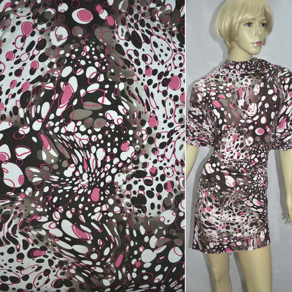 Трикотаж віскозний стрейч коричнево-білий з рожевими колами ш.140 купить в розницу и оптом