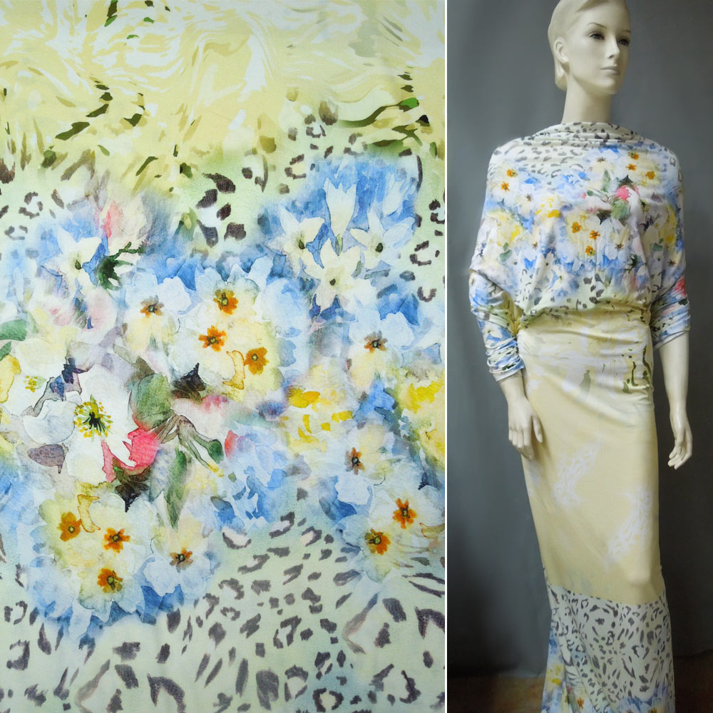 Трикотаж віскозний стрейч молочно-салатовий з синіми квітами і коричневим леопардом ш.146 купить в розницу и оптом