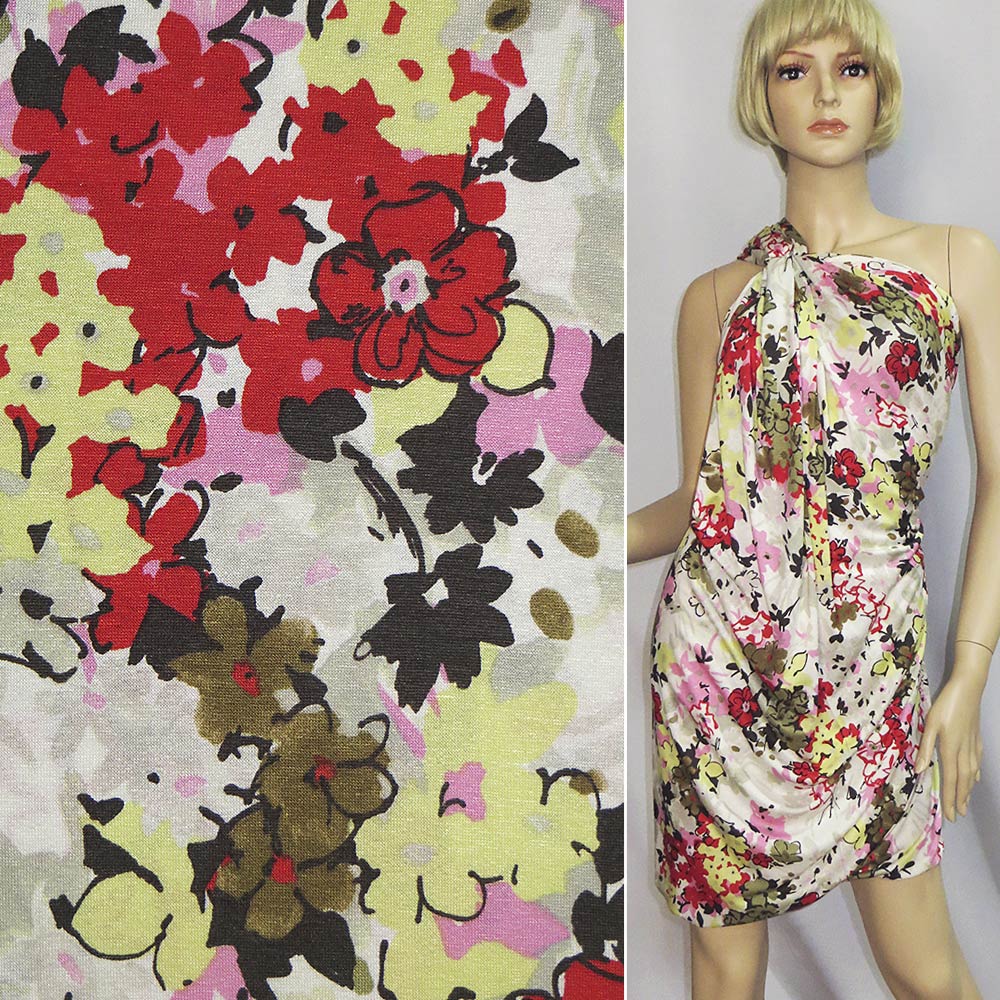 Трикотаж віскозний стрейч молочний з червоно-жовтими квітами ш.149. Склад тканини: Віскоза-96, Еластан-4. Щільність тканини 215 г/м.кв. Країна виробник: Німеччина. Трикотаж – це м'яка щільна матерія, не прозора. Приємна на дотик, комфортна в носінні. Завдяки вмісту синтетичних матерій, матеріал більш зносостійкий та надовго зберігає свій первісний вигляд. Тканина відрізняється своєю приємною текстурою, гарною розтяжністю, практично не здається. Трикотаж досить простий у догляді. Використовується для пошиття суконь, спортивних костюмів, легких жакетів, поло, футболок та багато іншого.Дякуємо за ваш вибір.