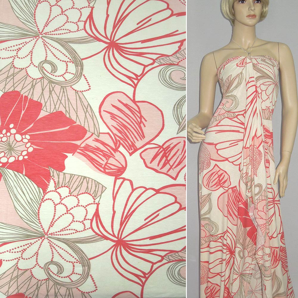 Трикотаж віскозний стрейч молочний з рожево-червоними квітами ш.150. Склад тканини: Віскоза-96, Еластан-4. Щільність тканини 107 г/м.кв. Країна виробник: Німеччина. Трикотаж – це м'яка щільна матерія, не прозора. Приємна на дотик, комфортна в носінні. Завдяки вмісту синтетичних матерій, матеріал більш зносостійкий та надовго зберігає свій первісний вигляд. Тканина відрізняється своєю приємною текстурою, гарною розтяжністю, практично не здається. Трикотаж досить простий у догляді. Використовується для пошиття суконь, спортивних костюмів, легких жакетів, поло, футболок та багато іншого.Дякуємо за ваш вибір.