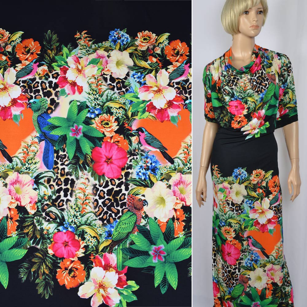 Трикотаж віскозний стрейч помаранчевий в яскраві квіти і птахи рапорт ш.151. Склад тканини: Віскоза-96, Еластан-4. Щільність тканини 170 г/м.кв. Країна виробник: Німеччина. Трикотаж – це м'яка щільна матерія, не прозора. Приємна на дотик, комфортна в носінні. Завдяки вмісту синтетичних матерій, матеріал більш зносостійкий та надовго зберігає свій первісний вигляд. Тканина відрізняється своєю приємною текстурою, гарною розтяжністю, практично не здається. Трикотаж досить простий у догляді. Використовується для пошиття суконь, спортивних костюмів, легких жакетів, поло, футболок та багато іншого.Дякуємо за ваш вибір.