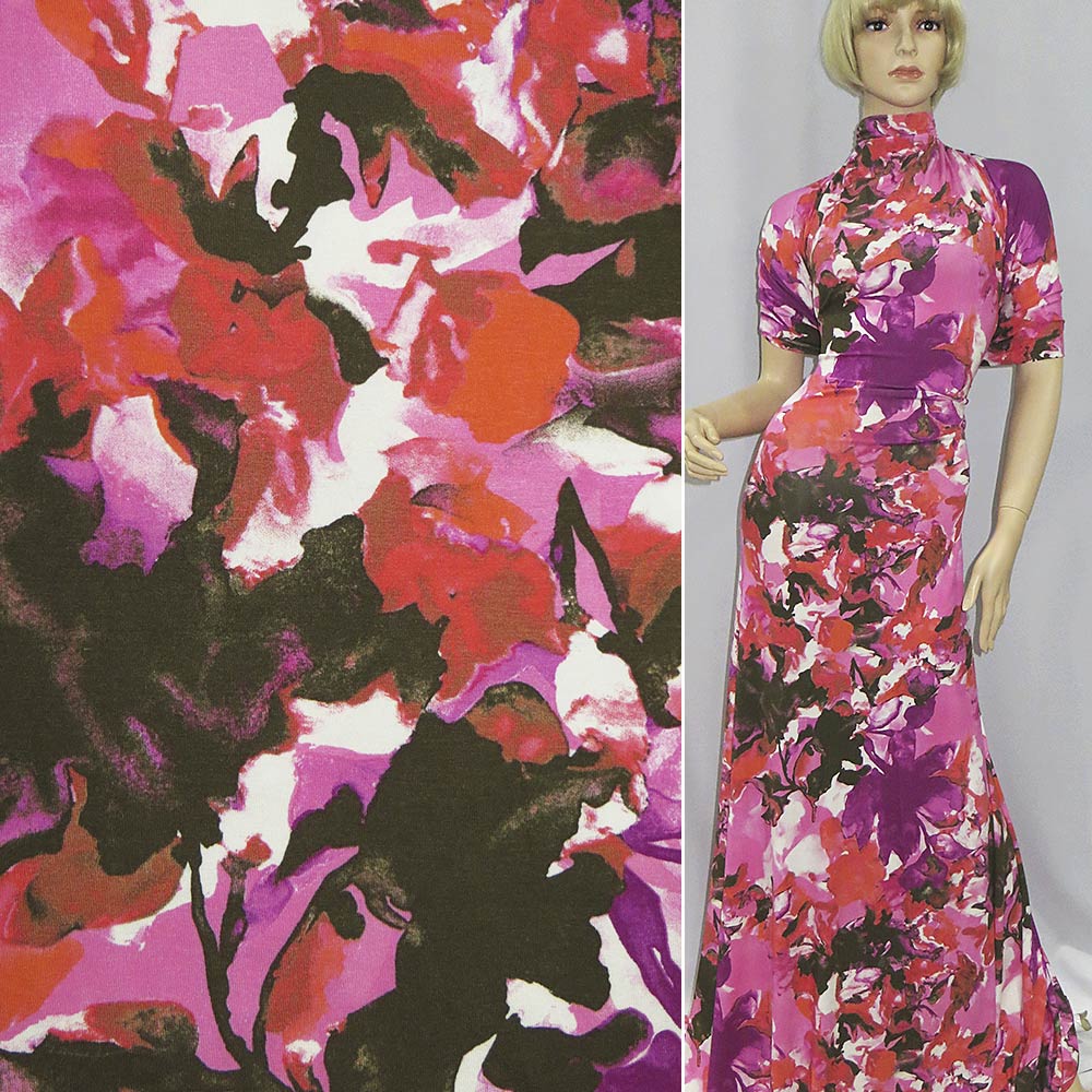 Трикотаж віскозний стрейч рожевий абстрактний квіти бузково-помаранчеві ш.145. Склад тканини: Віскоза-96, Еластан-4. Щільність тканини 221 г/м.кв. Країна виробник: Німеччина. Трикотаж – це м'яка щільна матерія, не прозора. Приємна на дотик, комфортна в носінні. Завдяки вмісту синтетичних матерій, матеріал більш зносостійкий та надовго зберігає свій первісний вигляд. Тканина відрізняється своєю приємною текстурою, гарною розтяжністю, практично не здається. Трикотаж досить простий у догляді. Використовується для пошиття суконь, спортивних костюмів, легких жакетів, поло, футболок та багато іншого.Дякуємо за ваш вибір.