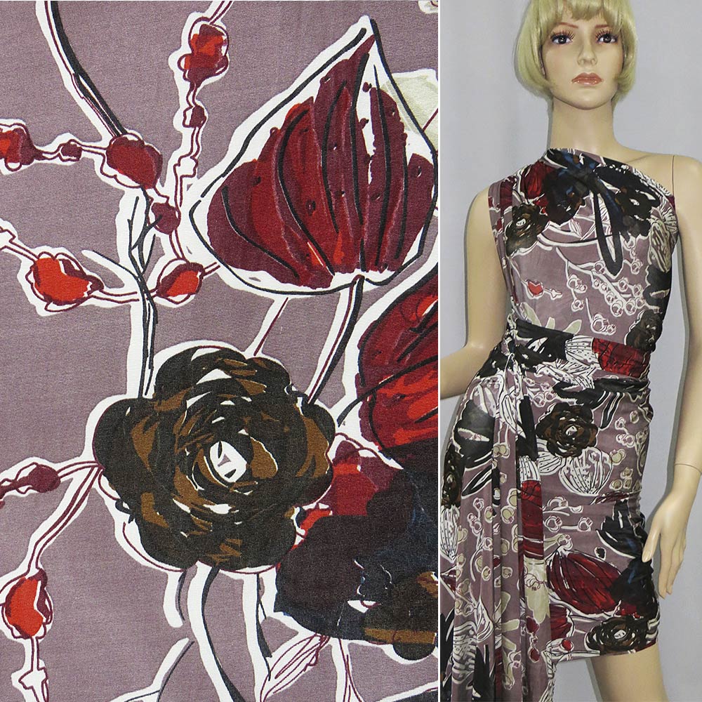 Трикотаж віскозний стрейч сіро-бузковий з червоними квітами ш.125 купить в розницу и оптом