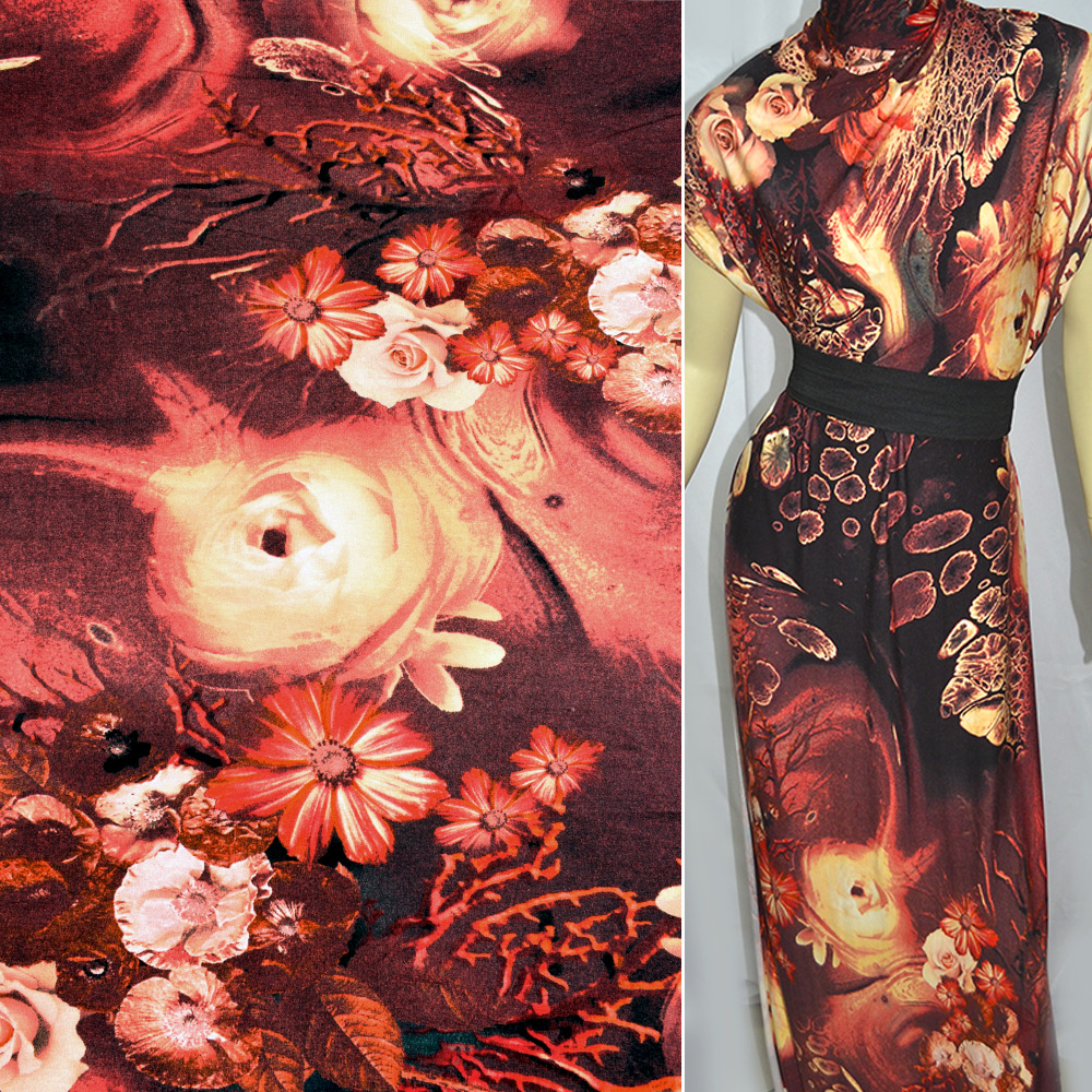 Трикотаж віскозний стрейч теракотовий з трояндами ш.150 купить в розницу и оптом