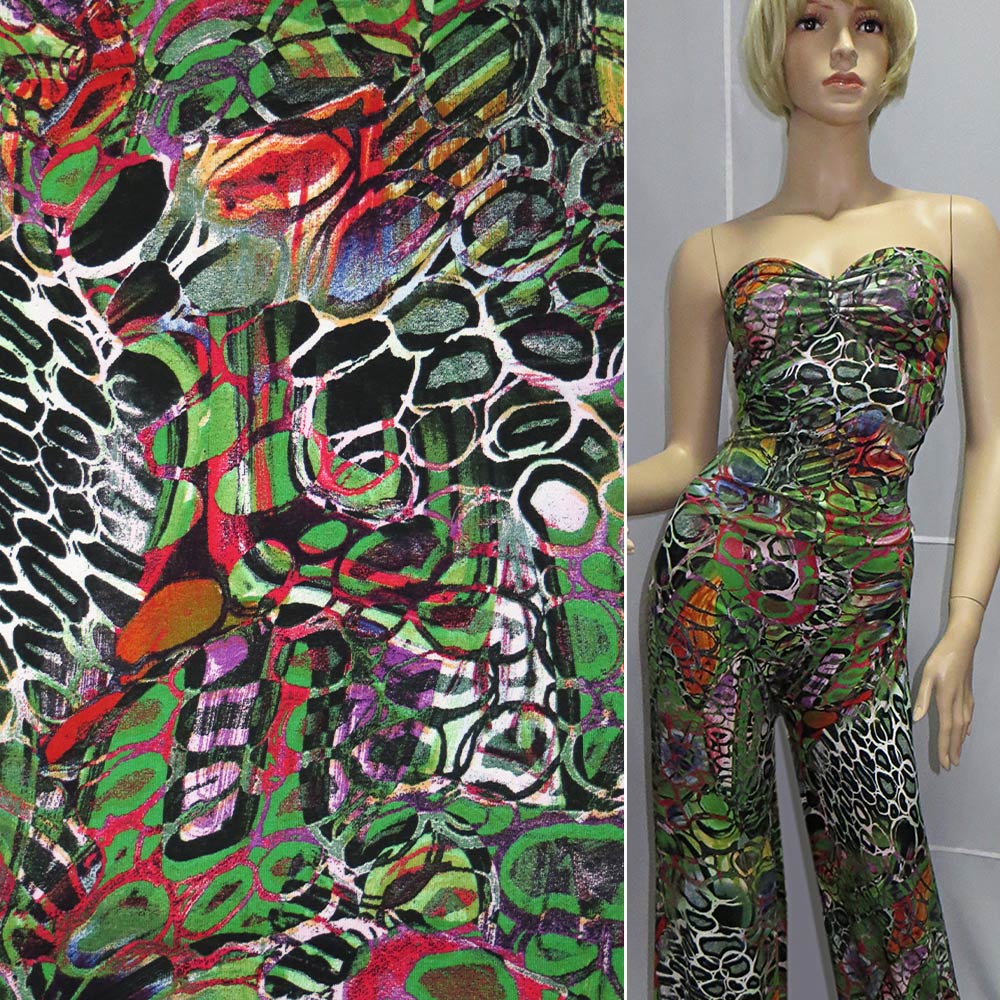 Трикотаж віскозний стрейч зелений в малиново-чорні кола ш.150 купить в розницу и оптом