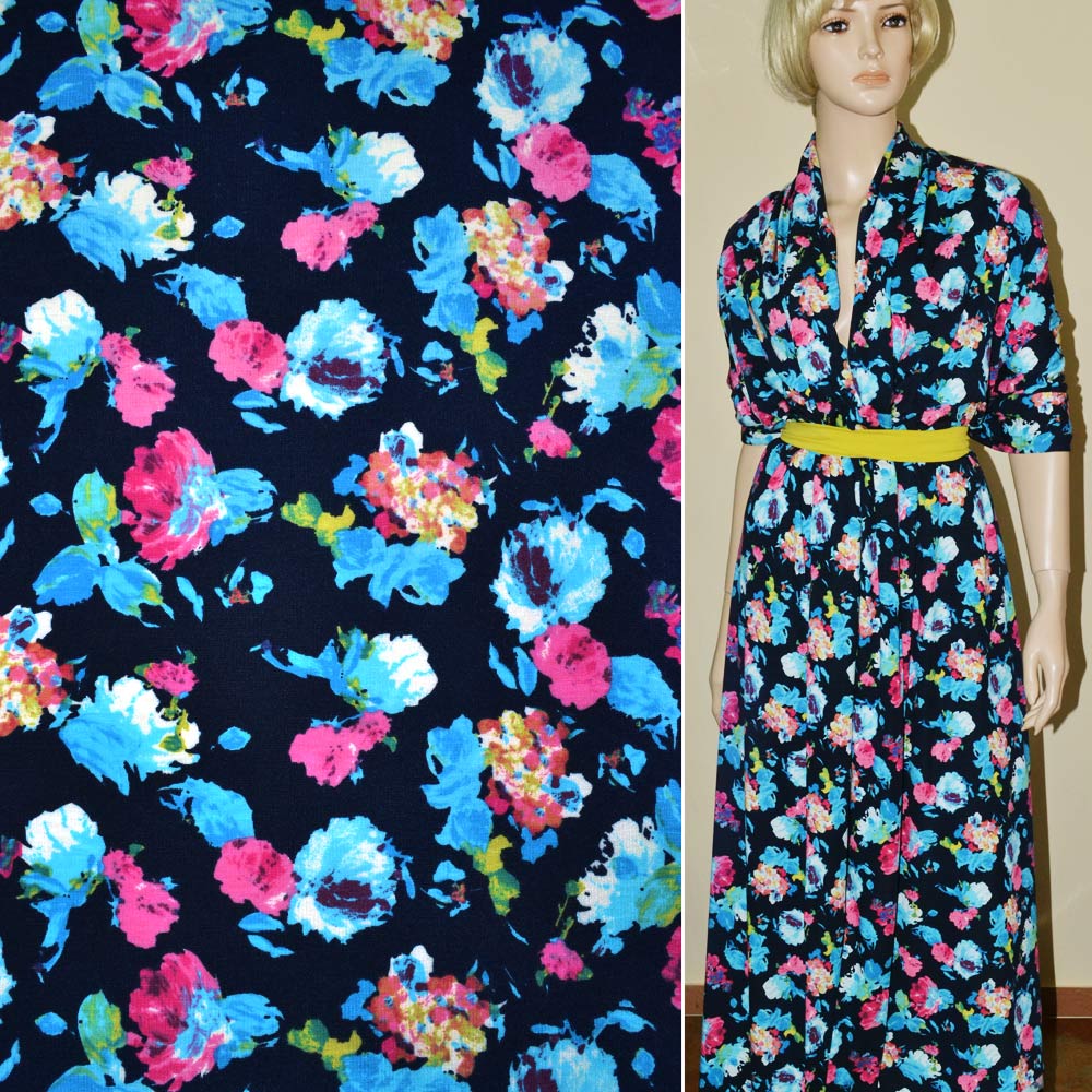 Трикотаж з віскозою синій темний з рожево-блакитними квітами ш.170. Склад тканини: Віскоза-20, Поліестер-80. Щільність тканини 167 г/м.кв. Країна виробник: Південна Корея. Трикотаж – це м'яка щільна матерія, не прозора. Приємна на дотик, комфортна в носінні. Завдяки вмісту синтетичних матерій, матеріал більш зносостійкий та надовго зберігає свій первісний вигляд. Тканина відрізняється своєю приємною текстурою, гарною розтяжністю, практично не здається. Трикотаж досить простий у догляді. Використовується для пошиття суконь, спортивних костюмів, легких жакетів, поло, футболок та багато іншого.Дякуємо за ваш вибір.
