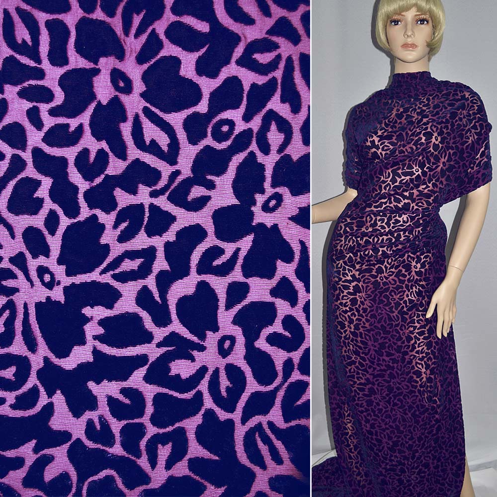 Оксамит на шифоні малиновий з темно-синіми кольорами ш.110. Склад тканини: Віскоза-30, Поліестер-20, Флок-20, Шовк-30. Щільність тканини 109 г/м.кв. Країна виробник: Південна Корея. Оксамит – ефектна тканина, текстура – ворсиста, складна. Технологія виготовлення передбачає переплетення п'яти ниток, чотири з яких утворюють основу, а п'ята – ворс. Матеріал часто плутають з велюром, хоча розрізнити їх досить просто: велюр має більш довгий ворс. Він неймовірно гарний приголомшливою грою світлотіні. Оксамит зберігає унікальну глибину кольору, здатну спалахнути несподіваними переливами. Досить щільна основа пояснює чудові здібності тканини оксамит до вишуканого драпірування. Матеріал не мнеться у виробах і не потребує прасування. По шовковому ворсу зручно вишивати срібними чи золотими нитками. Їх шиють вечірні вбрання, коктейльні облягаючі сукні, чудові піджаки та жакети. Дуже цікаві штори, а також оббивка меблів та оздоблення стін.Дякуємо за ваш вибір.