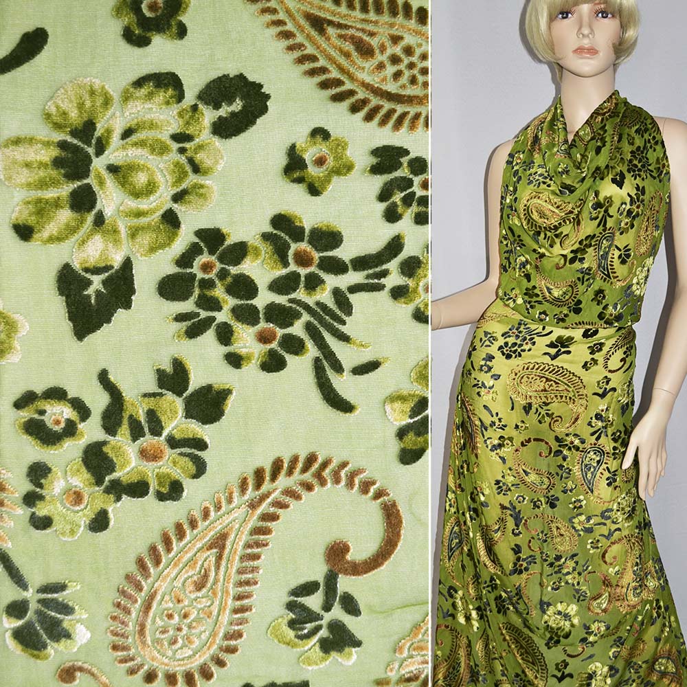 Оксамит на шифоні зелений з коричневими квітами та огірками ш.110 купить в розницу и оптом