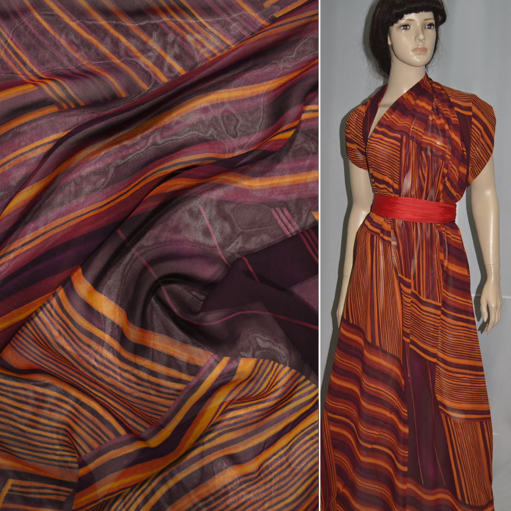 Віскоза блузочна бордова в жовто-коричневу смужку ш.140. Склад тканини: Віскоза-100. Щільність тканини 111 г/м.кв. Країна виробник: Південна Корея. За своєю структурою віскоза дуже нагадує шовк, легше ніж бавовна, а значить, що її доцільніше використовувати при пошитті літнього одягу. Їй не властиве накопичення статичної електрики, тобто при взаємодії з іншими тканинами чи поверхнями вона не електризується. Дане сукно є дуже приємним на дотик, м'яким і добре тягнеться, що дозволяє використовувати його у виробництві дитячого одягу та домашнього текстилю. Матеріал не схильний викликати алергічні реакції та дерматити. Можна використовувати для пошиття дитячого одягу. Віскоза приємна для тіла, сприяє зігріванню взимку та створює комфортну температуру у спеку. Матеріал сприяє вбирання вологи та пропускає повітря. Віскоза може бути абсолютно будь-якого кольору, після прання надовго зберігає привабливий та яскравий колір.Дякуємо за ваш вибір.