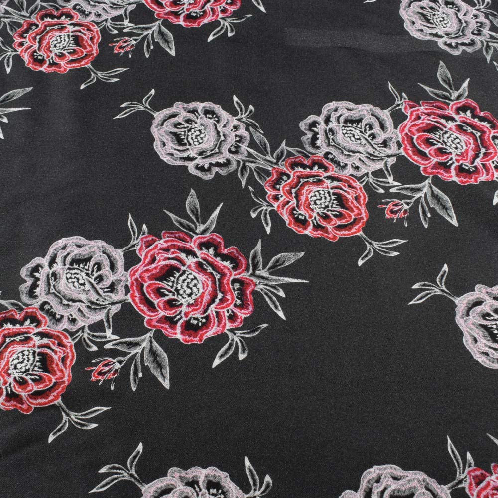 Віскоза сіра темна, принт вишиті троянди, ш.145. Склад тканини: Віскоза-100. Щільність тканини 158 г/м.кв. Країна виробник: Німеччина. Віскоза – це досить цікавий матеріал, тим, що він може бути схожим на шовк, шерсть чи льон. Тканина, яка виходить з віскози дуже приємна та м'яка на дотик, утворює на виробах гарні складки. Через свою досить високу гігроскопічність, віскоза здатна вбрати багато вологи, так, наприклад, в порівнянні з бавовною, вона вбирає її в два рази більше. З віскозного полотна шиють одяг, тому що "нетканка" вбирає вологу і "дихає", при цьому ніколи не викликає алергію. Найчастіше з віскози шиють підкладки для одягу. У домашньому господарстві можна часто зустріти віскозну постільну білизну, скатертини, штори.