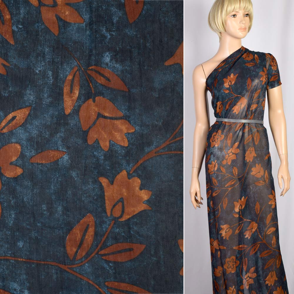 Віскоза синя в коричневі квіти, листя, ш.140 купить в розницу и оптом