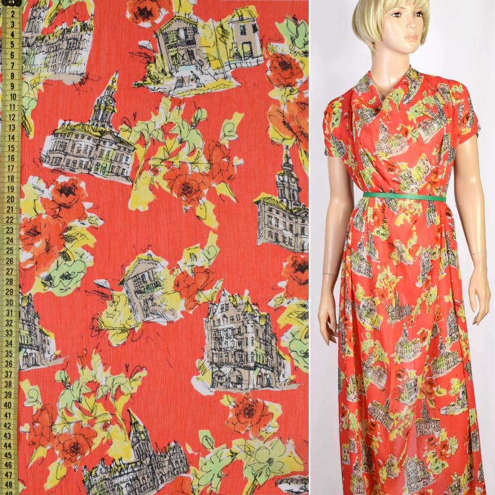 Віскоза жата червона, будівлі, троянди, ш.140 купить в розницу и оптом