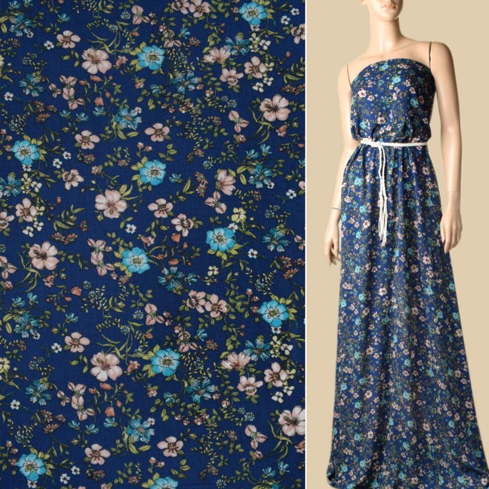 Віскоза жата синя, бірюзові, бежеві квіти, ш.131. Склад тканини: Віскоза-100. Щільність тканини 135 г/м.кв. Країна виробник: Південна Корея. Віскоза дуже м'яка і ковзна, що струмує і легко драпірується. Віскозна тканина має унікальну властивість — вона повністю переймає особливості та якості волокон, з яких вона виготовляється. Доступна у великій кількості кольорів, не линяє, не викликає алергію та екологічна. Завдяки тому, що тканина гарно струмує, драпірується, а віскоза трикотаж ще й тягнеться, вона дуже гарно виглядає на жіночій фігурі. Широко використовується віскоза і для одягу для дому для жінок і дітей - з нього шиються красиві і практичні піжами, халати. Штапельне ж віскозне полотно щільніше, з нього виробляються і теплі предмети одягу - пальто, кардигани, светри та водолазки, шапочки. З такої тканини виготовляються навіть пледи та килимові вироби.Дякуємо за ваш вибір.