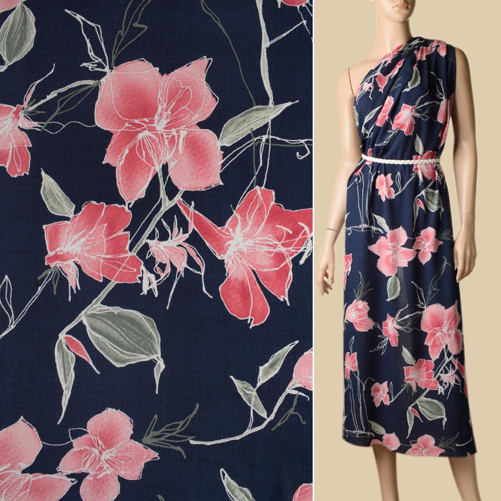 Віскоза жата синя темна, великі рожеві квіти, ш.150. Склад тканини: Віскоза-100. Щільність тканини 120 г/м.кв. Країна виробник: Південна Корея. Віскоза дуже м'яка і ковзна, що струмує і легко драпірується. Віскозна тканина має унікальну властивість — вона повністю переймає особливості та якості волокон, з яких вона виготовляється. Доступна у великій кількості кольорів, не линяє, не викликає алергію та екологічна. Завдяки тому, що тканина гарно струмує, драпірується, а віскоза трикотаж ще й тягнеться, вона дуже гарно виглядає на жіночій фігурі. Широко використовується віскоза і для одягу для дому для жінок і дітей - з нього шиються красиві і практичні піжами, халати. Штапельне ж віскозне полотно щільніше, з нього виробляються і теплі предмети одягу - пальто, кардигани, светри та водолазки, шапочки. З такої тканини виготовляються навіть пледи та килимові вироби.Дякуємо за ваш вибір.