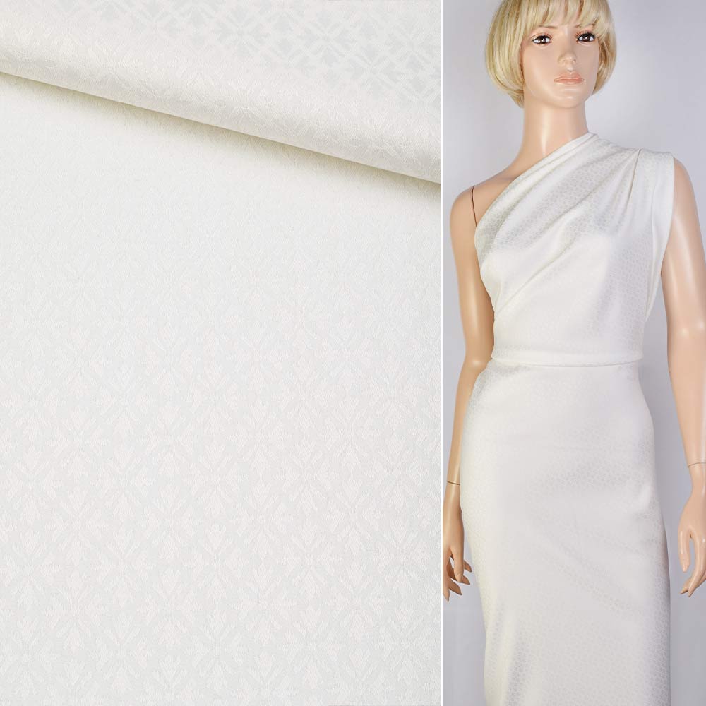 Жаккард стрейч молочний в невеликі квітки ш.155. Склад тканини: Віскоза-25, Поліестер-56, Бавовна-15, Еластан-4. Щільність тканини 177 г/м.кв. Країна виробник: Південна Корея. Жаккард – це ошатний матеріал з рівномірно витканим великим орнаментом. З жаккарда шиють домашні вироби, сукні, блузи, костюми. Його застосовують для оббивки меблів. Жаккард прикрасить будь-який виріб, який з нього буде пошитий. Незамінний він як штор, покривал, ошатний одяг. Приємний для тіла, сприяє зігріванню взимку і створює комфортну температуру в спеку. Матеріал сприяє вбирання вологи та пропускає повітря. Може бути будь-якого кольору, після прання надовго зберігає привабливий та яскравий колір.Дякуємо за ваш вибір.